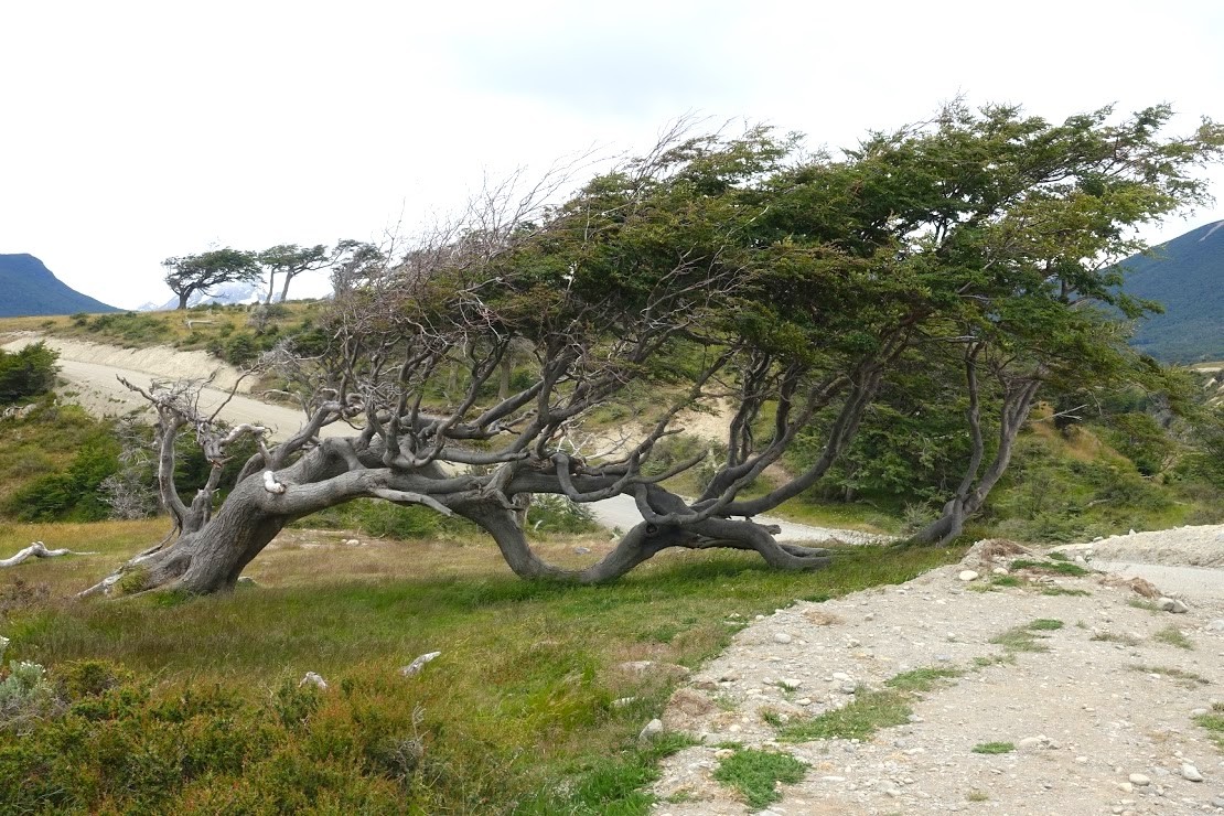 パタゴニアの風の強さをものがたる、ウシュアイア郊外にある木々。あまりの強風に、盆栽のような姿をしています。風がなくてもこのままです。