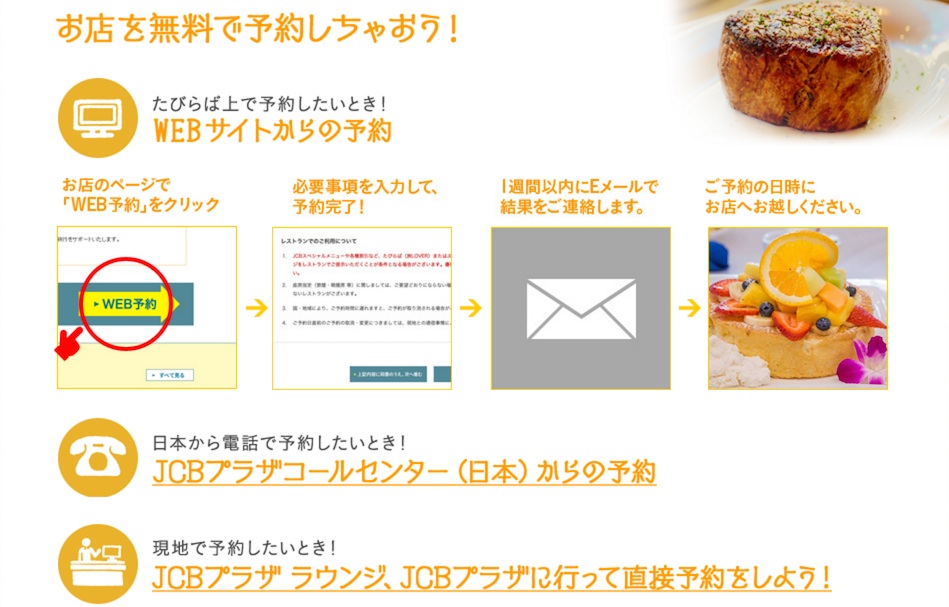また、JCBでは、世界中の加盟店の優待サービスを受けられる「たびらば」というサービスを提供しています。手数料なしで電話・ネット経由で有名レストランの手配をしてくれるという優れもので、しかもJCBならではの優待サービスがあるのですから、使わない手はありません。